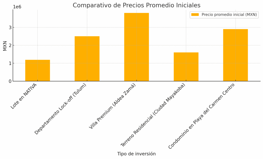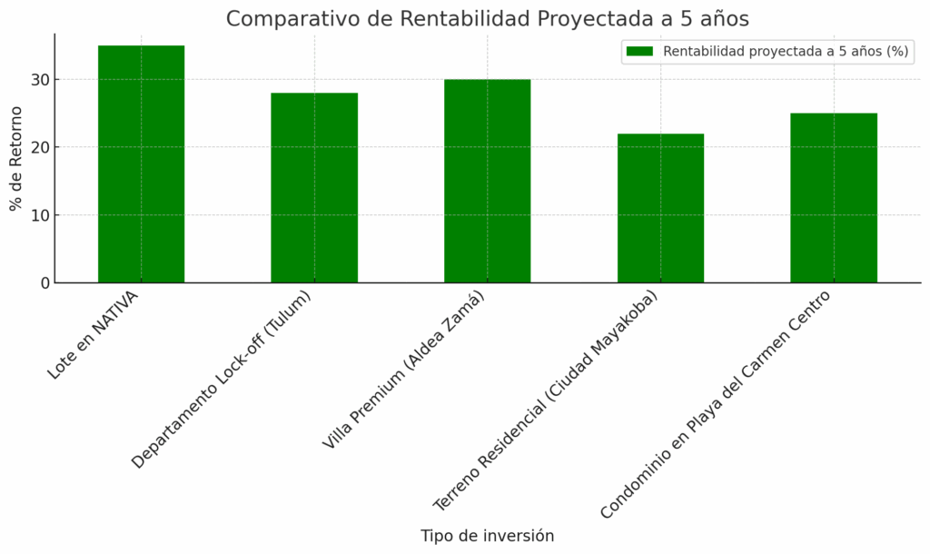 Muestra cómo NATIVA representa una de las opciones más accesibles en cuanto a inversión inicial, especialmente si se compara con villas o condominios en zonas ya consolidadas como Aldea Zamá o el centro de Playa del Carmen. - Comparativo de Rentabilidad Proyectada a 5 años (%):