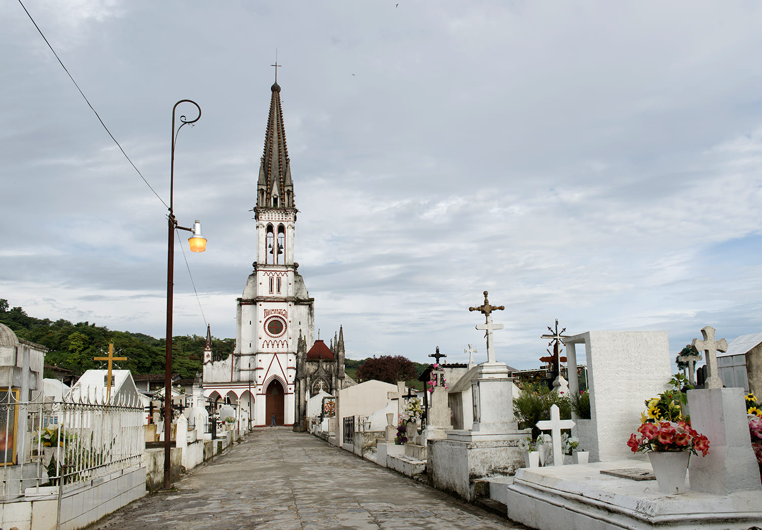 Famosa por las cientos de pequeñas piezas de barro que adornan su torre, convirtiéndola en uno de los templos más peculiares del país. Su fachada blanca y su diseño sencillo destacan entre las calles empedradas y la niebla típica del pueblo. Es un símbolo del sincretismo y la identidad local.