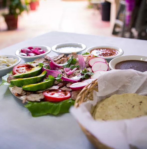- Poc chuc, carne de cerdo marinada y asada al carbón, acompañada de cebolla morada y tortillas recién hechas