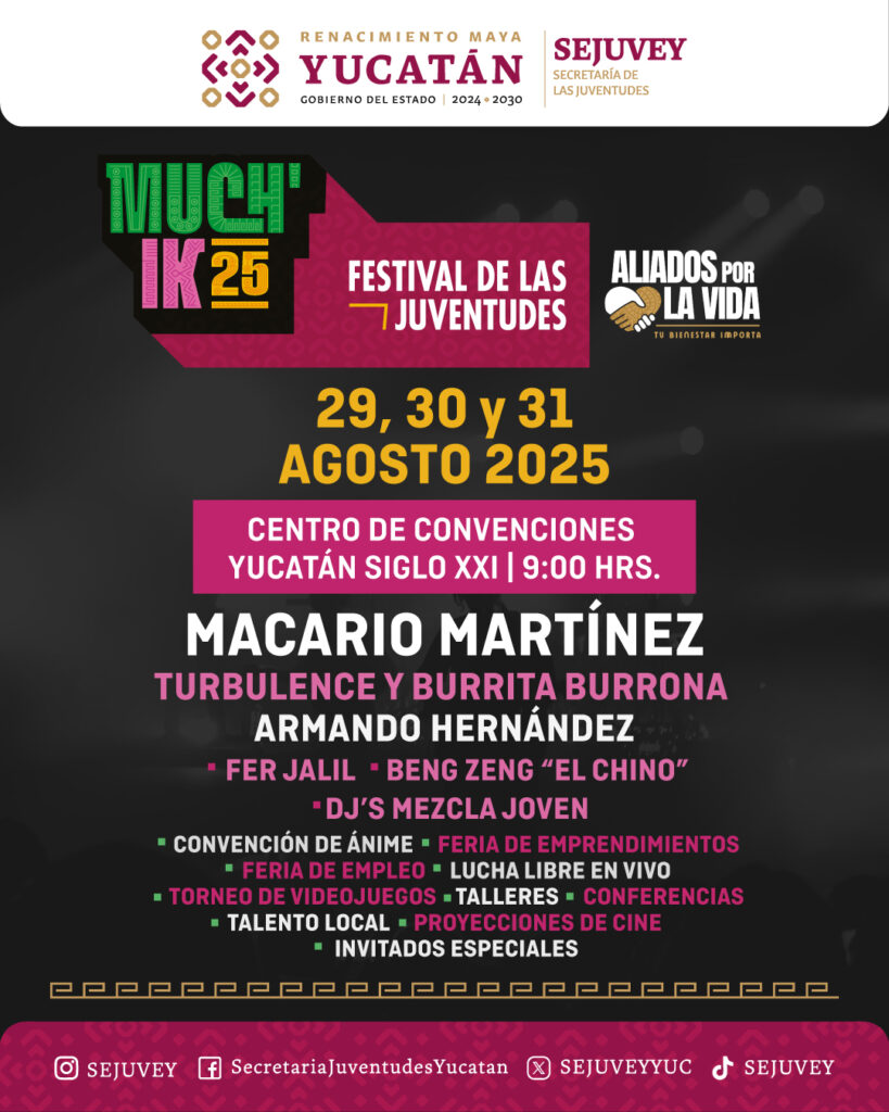 Prepárate para tres días de pura energía, talento, música, cosplay, videojuegos y mucho más en el evento juvenil más grande del año en Yucatán: el Festival Much’Ik de las Juventudes 2025.