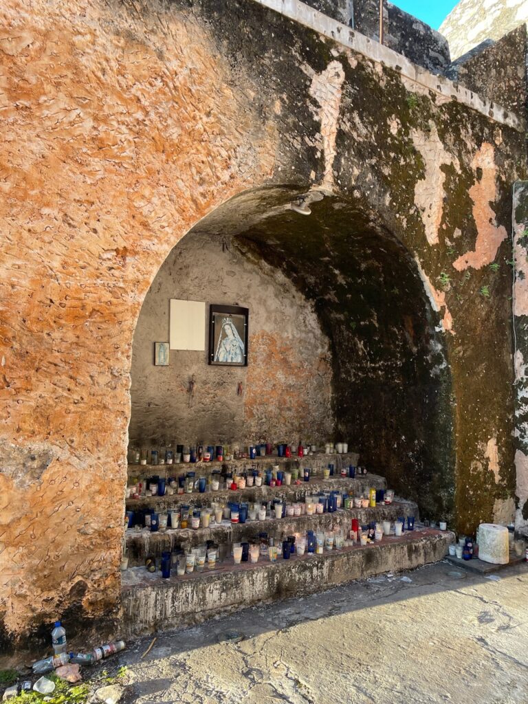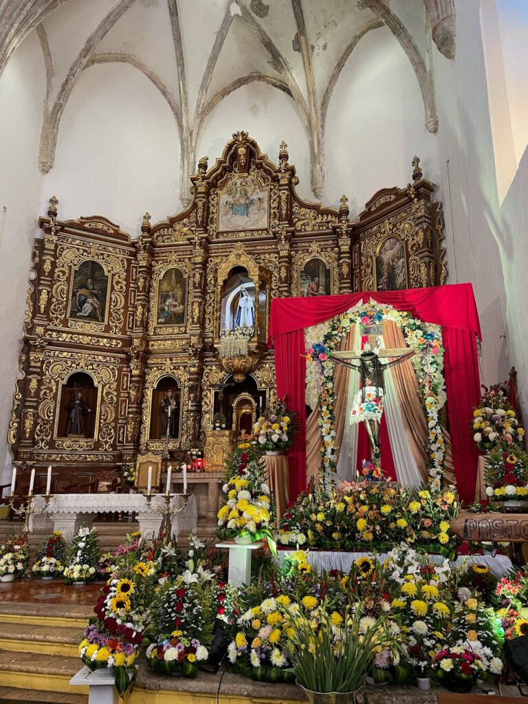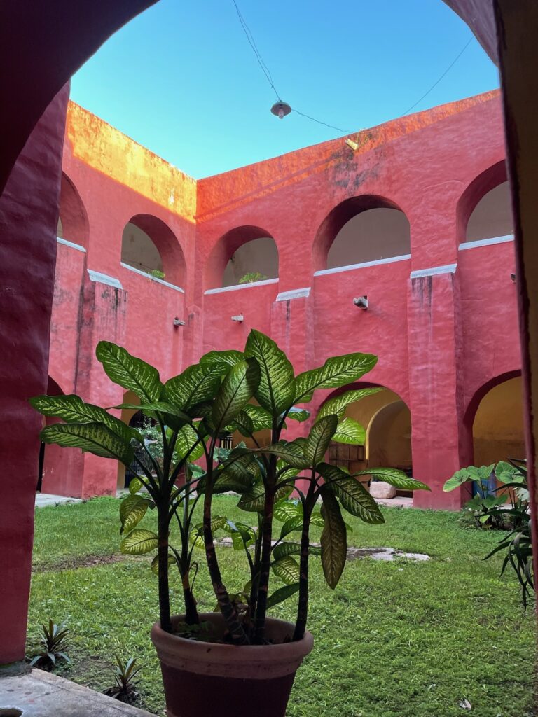 Entrar respetuosamente a la iglesia del Convento de San Antonio de Padua nos reveló un detalle sorprendente: patios internos ocultos, muros color mamey y un jardín interior que parece sacado de otro tiempo. Desde ciertos ángulos, el convento parece un castillo gótico inglés anclado en la historia yucateca.