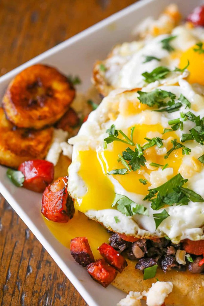 - Huevos estrellados o fritos colocados sobre los frijoles.