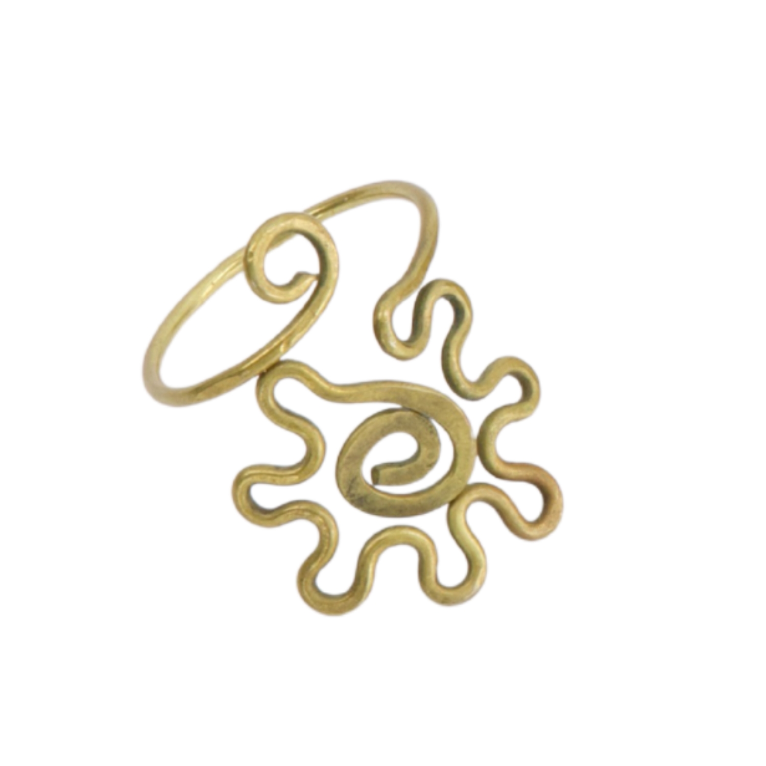 Forjado en bronce con acabado artesanal, su diseño abierto y espiralado hace referencia al movimiento del sol, el fluir del tiempo y la mirada eterna de quien observa más allá. Es una joya de carácter, ideal para espíritus libres y viajeros de alma.